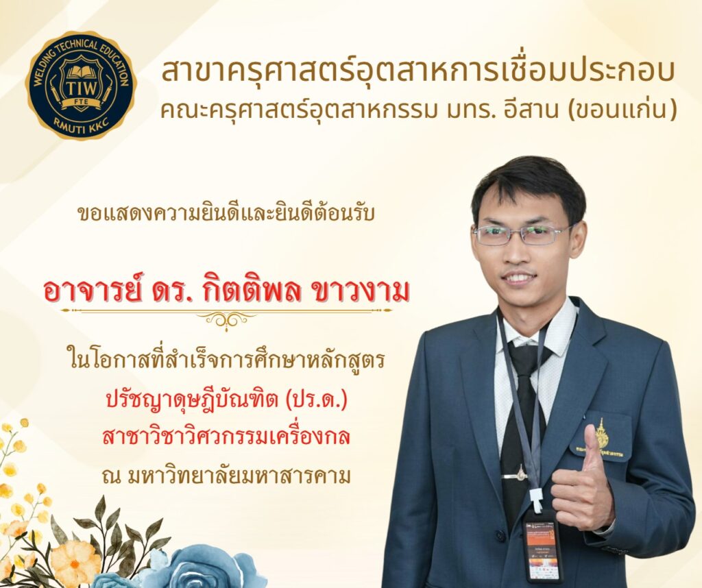 อาจารย์สาขาครุศาสตร์อุตสาหการเชื่อมประกอบ ในโอกาสที่สำเร็จการศึกษาหลักสูตร “ปรัชญาดุษฎีบัณฑิต (ปร.ด.)” สาชาวิชาวิศวกรรมเครื่องกล จากมหาวิทยาลัยมหาสารคาม เมื่อวันที่ 1 ธันวาคม 2568